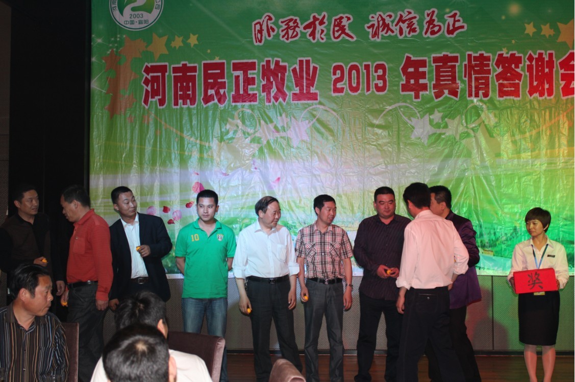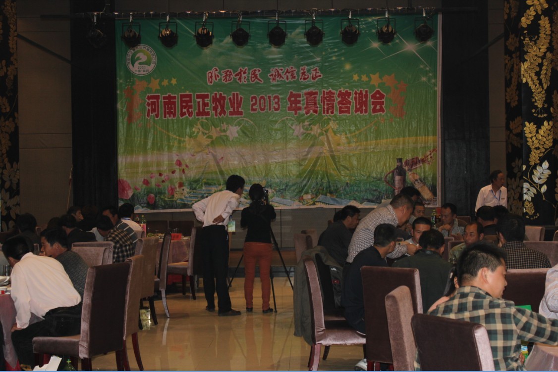 河南民正牧業有限公司自2003年成立至今,所取得的輝煌成績離不開客戶們的鼓勵和支持,有了感恩才有了天長地久,為了我們長遠的共同發展,2013年4月27日至28日,河南民正牧業特意在宜陽縣錦屏商務酒店,準備了這場近百人的“風雨同舟,共謀發展”答謝會。此次會議目的在于“促成同行交流,突破行業堅冰;攜手良性發展,共謀豬業春天!”的目的,以“答謝老客戶+回饋新客戶+同行精英交流碰撞”為宗旨,歷時兩天時間,于4月28日2點鐘***結束,也得到了客戶們的一致贊同,覺得通過此次交流學到很多的***上的知識和養殖業發展的獨特見解。